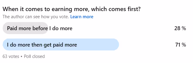 Progression falls apart when no one knows what comes first: the higher pay or the higher level of contribution. According to a LinkedIn poll, 71% of employees believe they should demonstrate more before expecting a pay increase. But more than 1 in 4 feel the pay should come first so they can step into the bigger expectations.