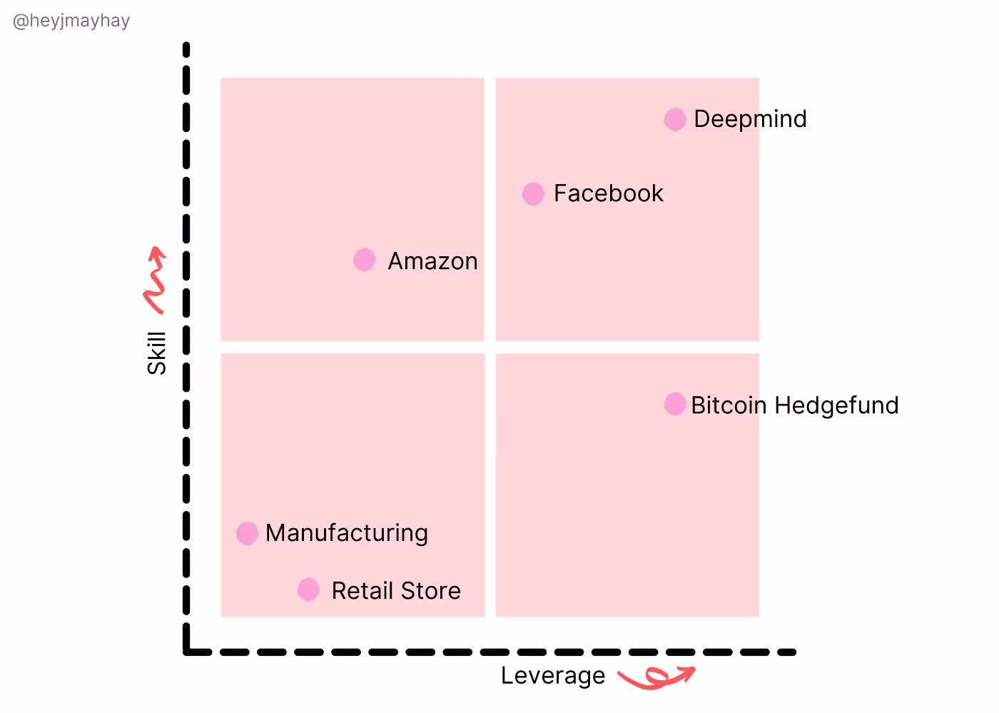 In her groundbreaking article, Approaching Pay (a bit) Like Pricing, Jessica suggests defining your roles using two values: skill and leverage. Skill is the expertise people bring, and leverage is the value that people individually add to the business; a product designer might have more leverage than a receptionist (or vice versa, if you work in PR). Her grid shows company roles placed according to their skill and leverage. The most highly-paid positions fall in the top right quadrant.